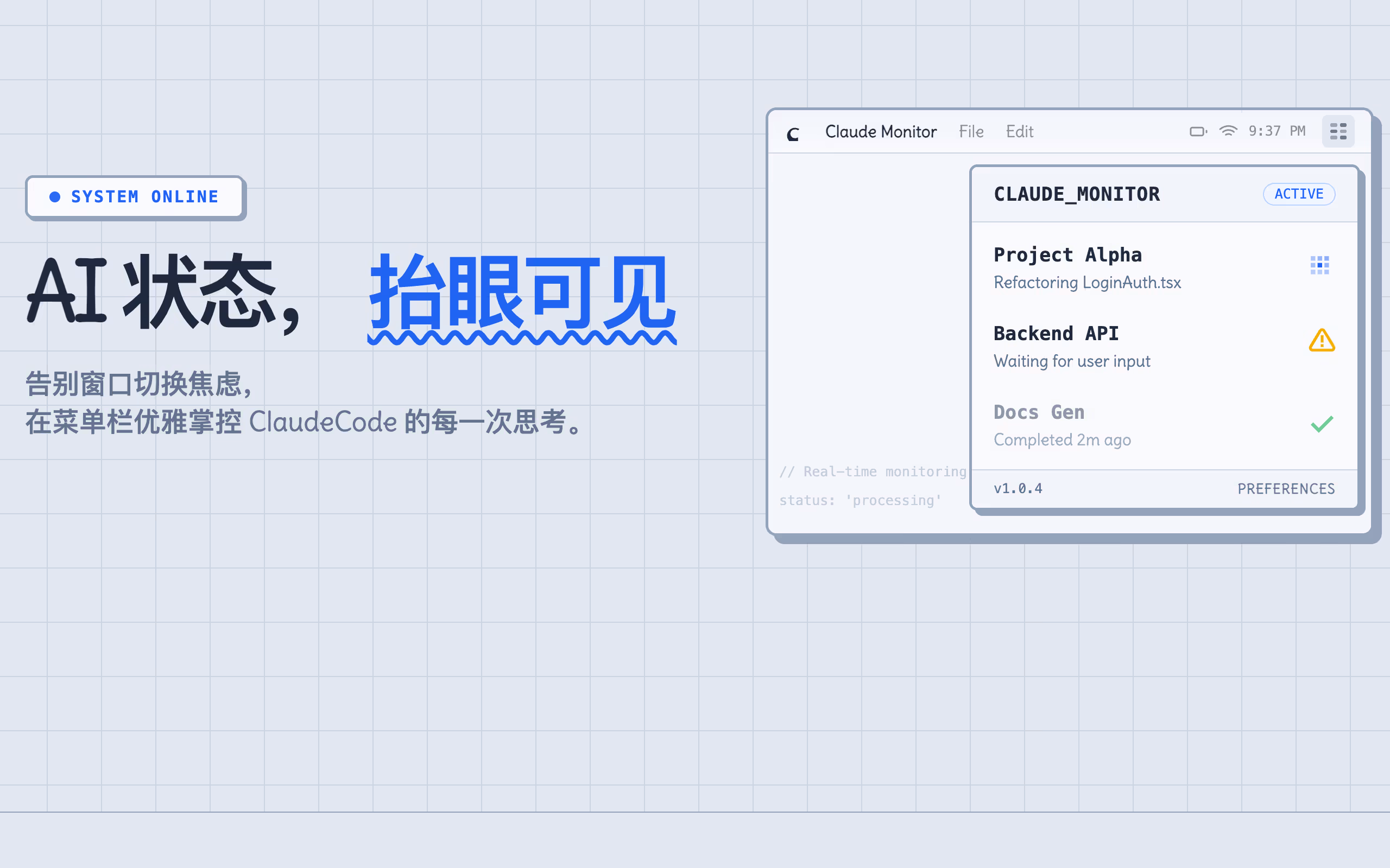 📟Claude MonitorMacOS 插件,监控 Claude Code 运行状态Claude Code 在后台运行时不知道当前状态,需要频繁切换窗口查看进度。SwiftBarClaude Code+1
